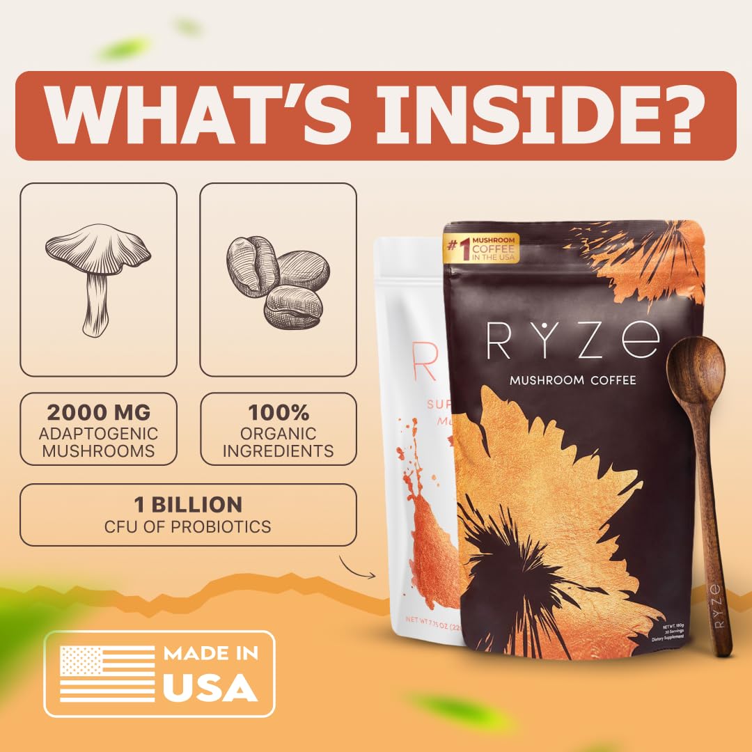 - COFFEE, BUT BETTER: Powered by 6 adaptogenic mushrooms and Probiotics, the RYZE n Shine Bundle gives you all the energy and focus of regular coffee, with none of the jitters & crashes